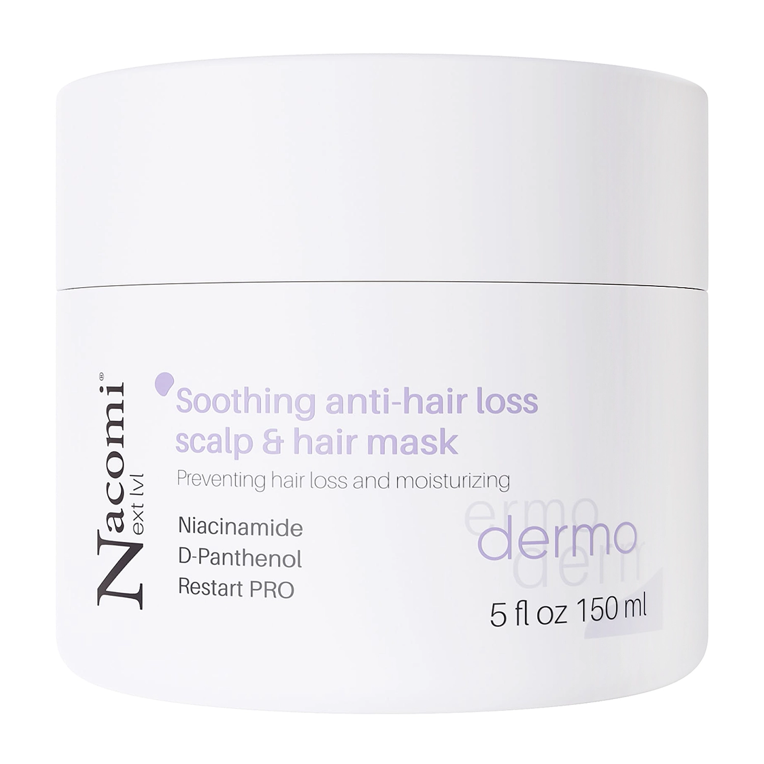 Nacomi - Next Level - Soothing Anti-Hair Loss Scalp & Hair Mask - maska kojąca do włosów i skóry głowy. W składzie znajduje się RESTART PRO będący składnikiem aktywnym, który tworzy na włosach barierę ochronną, zapewnia łatwiejsze rozczesywanie włosów, dodaje im blasku oraz zwiększa ich wytrzymałość. Dodatek pantenolu koi i łagodzi podrażnienia skóry głowy, a w  przypadku włosów zapewnia odpowiednie nawilżenie, elastyczność oraz pomaga zredukować łamliwość i rozdwajanie się końcówek. Maskę wzbogacono również o 7 wzmacniających ekstraktów roślinnych, które zwiększają ukrwienie skóry głowy, zagęszczają włosy i stymulują ich wzrost. W skład mieszanki wchodzą m.in. ekstrakty z pokrzywy, arniki, szałwii i rozmarynu.
