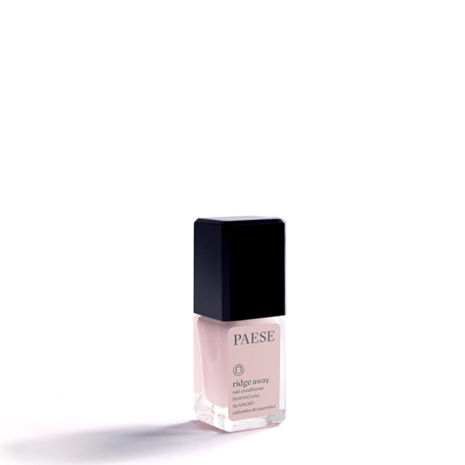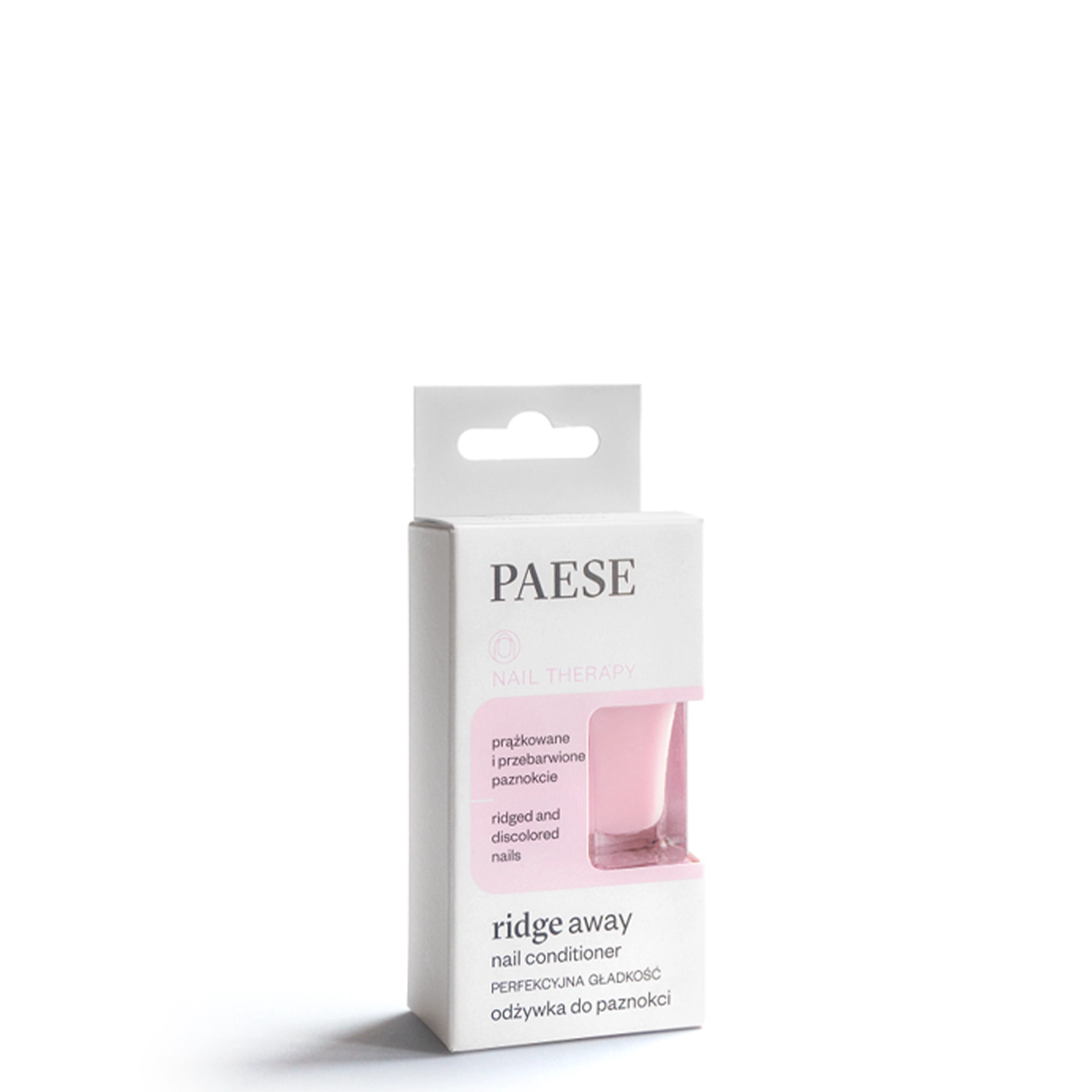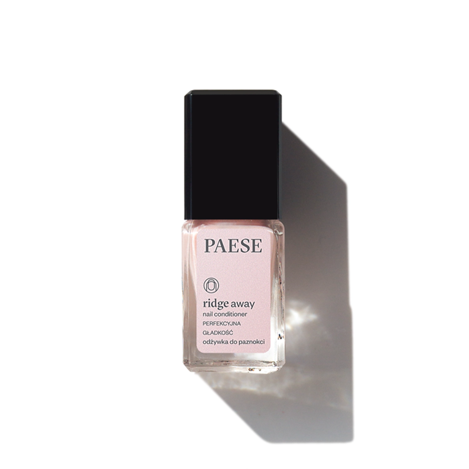 Paese – Ridge Away – Odżywka do Przebarwionych Paznokci - odżywiający preparat do paznokci o lekko różowym kolorze. Zawiera antyoksydacyjną witaminę E oraz ekstrakt z szarotki alpejskiej, posiadający właściwości przeciwzapalne. Nitroceluloza pozwala uzyskać wzmacniającą powłokę i nadaje subtelny połysk płytce. Tak skomponowana mieszanka składników działa redukująco na przebarwienia podczas systematycznego stosowania oraz jest wegańska.