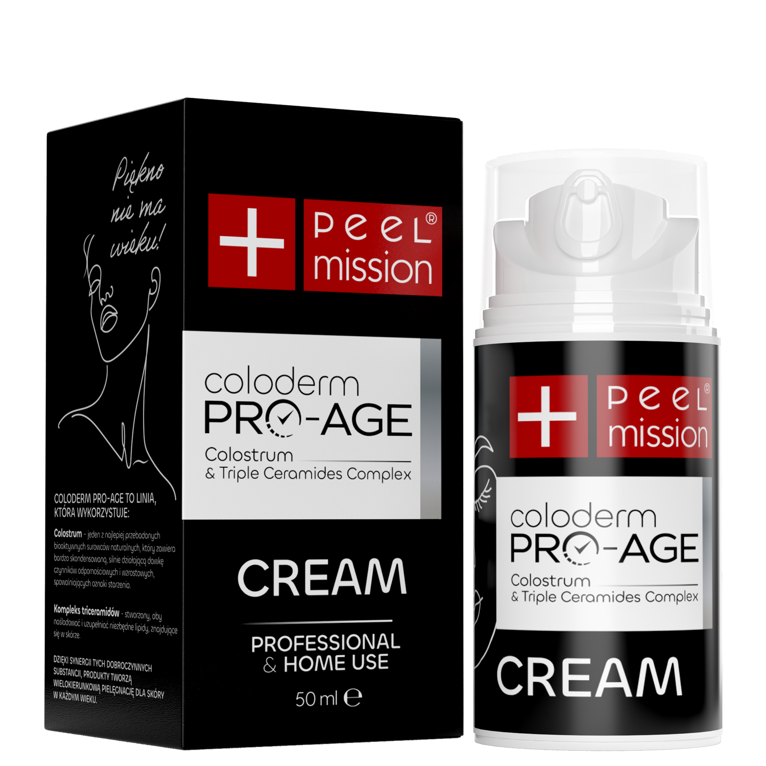 Peel Mission - Coloderm Pro - Age Cream - krem do twarzy o skoncentrowanym składzie, wypełnionym aktywnymi składnikami, które wzmacniają skórę i poprawiają jej kondycję. W formule zawarto Colostrum, który jest bioaktywnym składnikiem naturalnym i wykazuje skuteczne działanie w spowalnianiu oznak starzenia. Ponadto silnie regeneruje skórę. Dodatek ceramidów oraz cholesterolu wzmacnia barierę ochronną skóry, chroni przed przesuszeniem i odżywia. Ponadto kwas hialuronowy głęboko nawilża, a fitosfingozyna chroni przed czynnikami zewnętrznymi.
