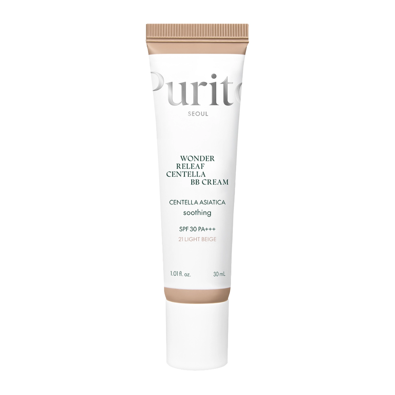 Purito Seoul - Wonder Releaf Centella BB Cream SPF30 PA+++ #21 Light Beige - krem BB łączący w sobie zalety średniego poziomu krycia niedoskonałości, z pielęgnacją i dodatkową ochroną przeciwsłoneczną. W tym celu do formuły kremu BB zostały dodane filtry fizyczne z ochroną na poziomie SPF 30 PA+++. Posiada lekką formułę, pozostawiającą na skórze naturalny efekt promiennej skóry oraz przemyślaną gamę kolorystyczną, łatwo łączącą się ze skórą. Zawarty w formule ekstrakt z wąkroty azjatyckiej nawilża, łagodzi podrażnienia i zapewnia ukojenie, a dodatek pantenolu i niacynamidu pomaga wzmocnić barierę hydrolipidową. Zapewnia naturalnie wyglądające, miękkie wykończenie z delikatnym glow. Ma bezzapachową i wegańską formułę. Kosmetyk wyróżniony został oznaczeniem cruelty free.