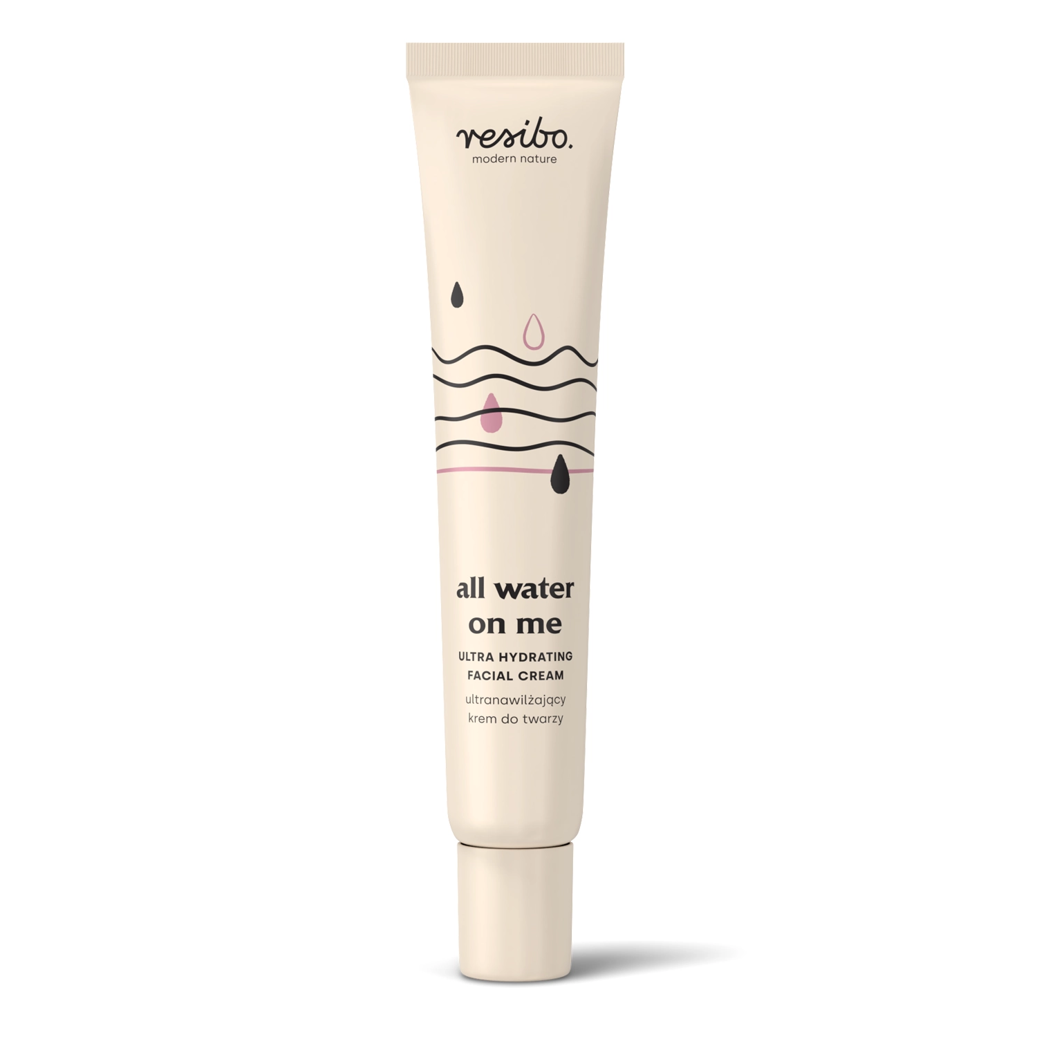 Resibo - All Water On Me ultranawilżający krem do twarzy. Zawiera kompozycję czterech rodzajów i wielkości kwasu hialuronowego, dzięki czemu intensywnie nawadnia skórę i zapewnia jej elastyczność. Wygładza, odżywia i sprawia, że staje się ona miękka w dotyku. Dodatek witaminy E oraz oleju jojoba wzmacnia długotrwałe nawilżenie. Krem odpowiedni jest dla każdego typu cery i w 97% składa się z surowców naturalnych.