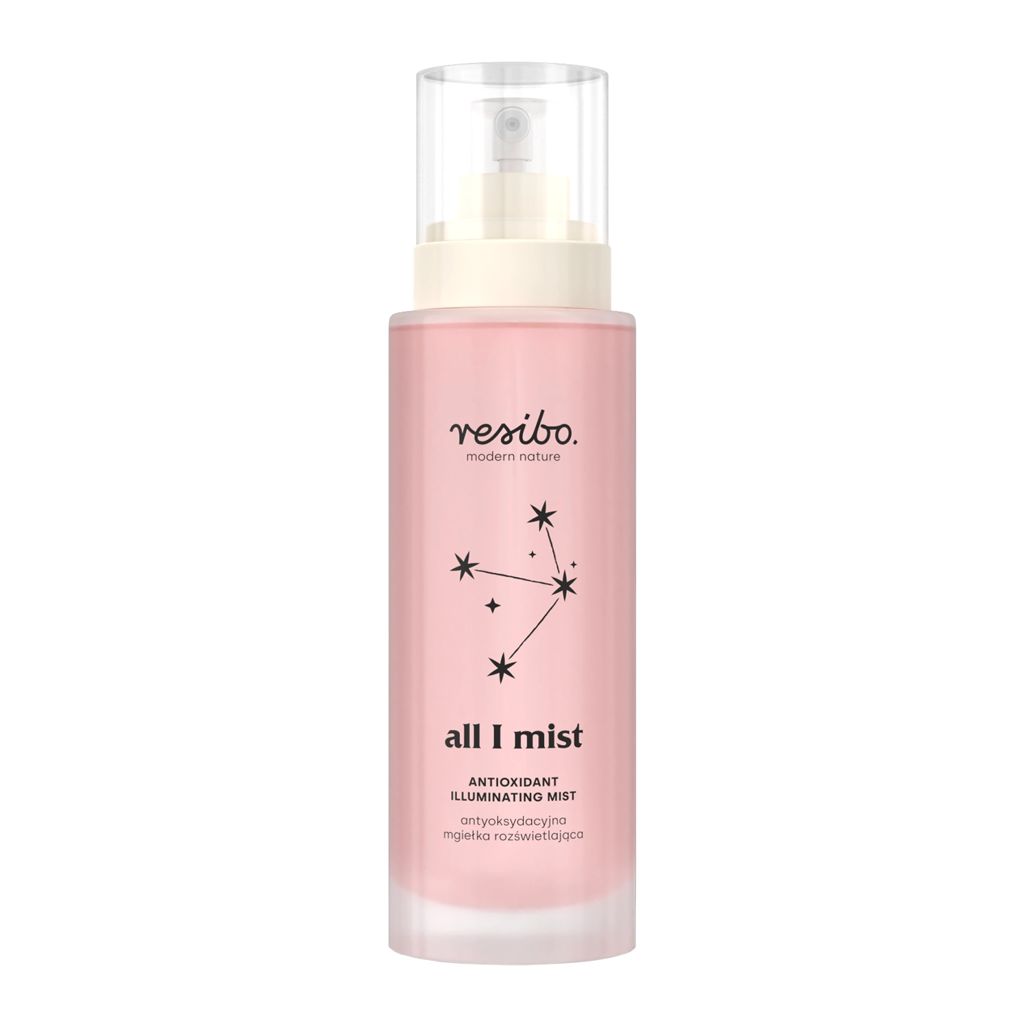 Resibo -  All I Mist - ochrona antyoksydacyjna w formie ultralekkiej, rozświetlającej mgiełki. Stworzona w 93,9% ze składników naturalnych, chroni skórę przed czynnikami zewnętrznymi. Jej zaawansowana formuła łączy w sobie niacynamid w stężeniu 3%, stabilną witaminę C - silne przeciwutleniacze o właściwościach rozświetlających. Dodatek ekstraktów roślinnych z zielonej herbaty i jagód acai wzmacnia ochronę przed stresem oksydacyjnym i nawilża. Swój subtelnie różowy kolor zawdzięcza kojącej witaminie B12. Świetnie sprawdzi się na etapie pielęgnacji w ciągu dnia dla odświeżenia, a także do utrwalenia makijażu. Regularne stosowanie produktu dostarcza skórze dawkę antyoksydacji, poprawia jej kondycję i rozświetla.