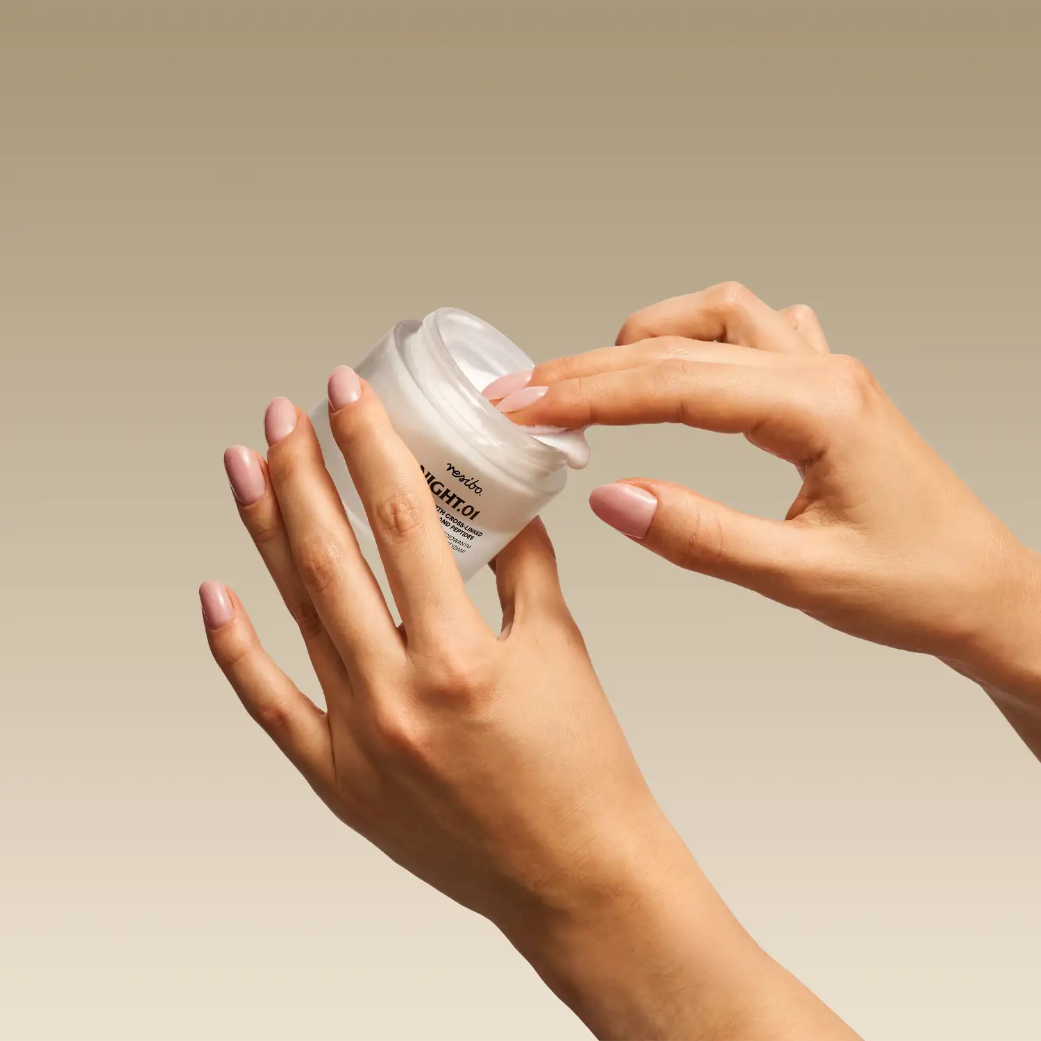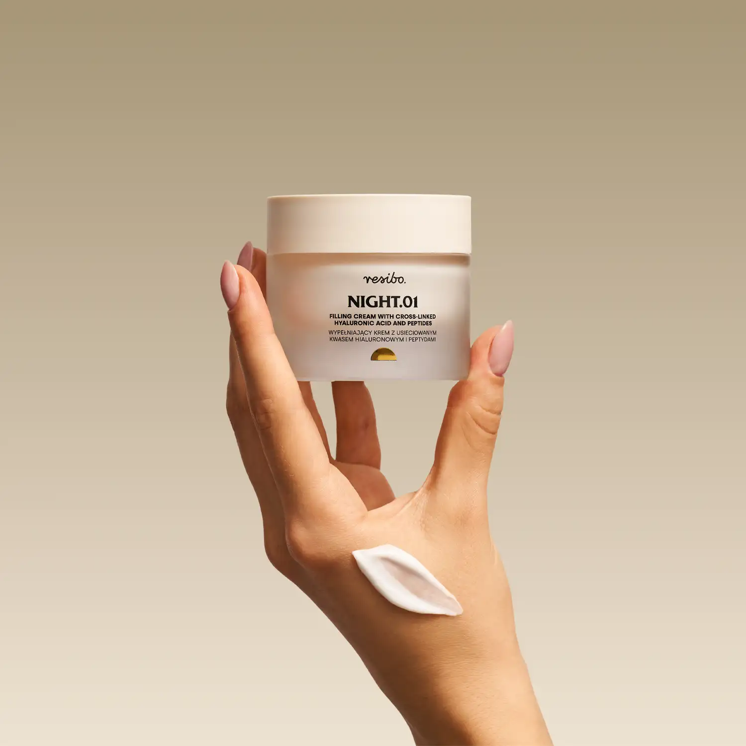 Resibo - NIGHT.01 - wypełniający krem do twarzy. Zawiera cztery formy kwasu hialuronowego i kompleks wygładzających peptydów, które wspólnie wyraźnie poprawiają napięcie skóry, nawilżają i utrzymują wilgoć na dłużej, a także stopniowo przywracają skórze elastyczność. Dodatek niacynamidu zwiększa właściwości przeciwstarzeniowe produktu, a masło shea i olej ze słodkich migdałów przywracają skórze komfort od pierwszej aplikacji. Krem stanowi wsparcie regeneracji skóry podczas nocy, by rano cera była gładsza i bardziej sprężysta. Receptura kremu jest wegańska, w 95% ze składników naturalnych i nie była testowana na zwierzętach.
