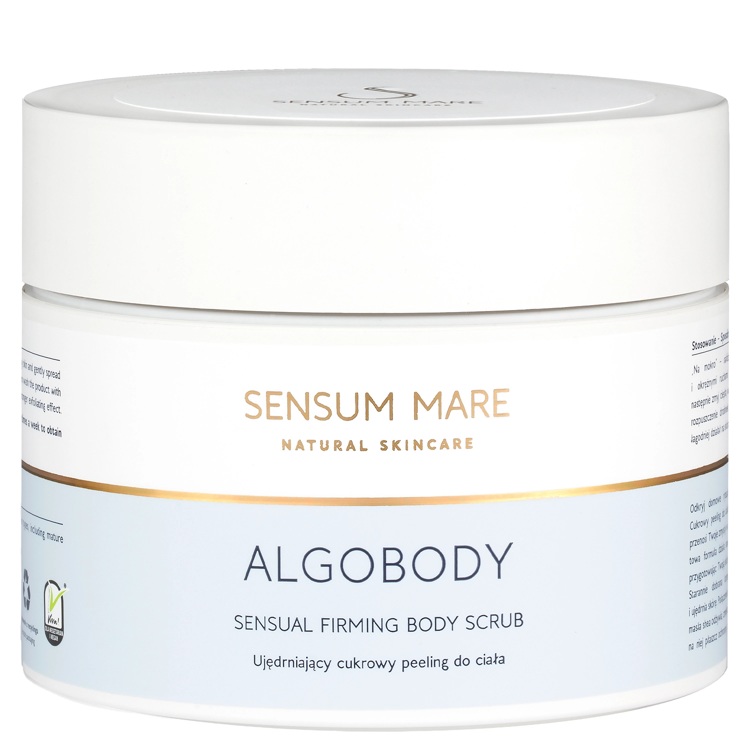 Sensum Mare - Algobody - Sensual Firming Body Scrub - cukrowy peeling do ciała, który skutecznie usunie martwe komórki naskórka, pozostawiając przyjemnie miękką i wygładzoną skórę. W składzie zawiera kompleks olejów z ekstraktów z alg, który wpływa na ujędrnienie skóry oraz zwiększenie jej elastyczności, a także kompozycję Algomega NP utrzymującą odpowiedni poziom nawilżenia. Co więcej, dodatek oleju kokosowego wspomaga regenerację, a witamina E chroni przed szkodliwym działaniem wolnych rodników i przedwczesnym starzeniem skóry. Produkt został stworzony z 99% składników pochodzenia naturalnego i jest odpowiedni dla wegan.
