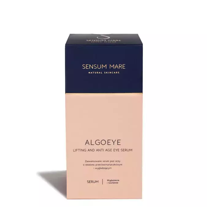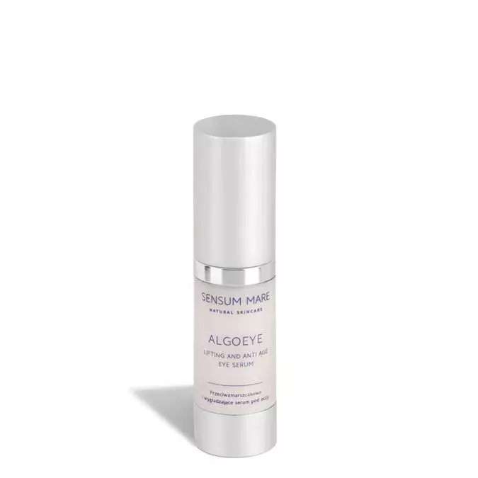 Sensum Mare - Algoeye Serum - Lifting And Ani Age Eye Serum - przeciwzmarszczkowe serum, które dzięki zawartości składników aktywnych odmładza delikatną okolicę oczu. W składzie znajduje się niacynamid o właściwościach rozjaśniających i antyoksydacyjnych, a także kofeina, która poprzez pobudzenie mikrokrążenia zmniejsza opuchliznę oraz rozjaśnia cienie pod oczami. Kwas hialuronowy utrzymuje optymalny poziom nawilżenia i wygładza. Z kolei peptydy zapobiegają pogłębianiu się zmarszczek, stymulują syntezę kolagenu, dzięki czemu działają przeciwstarzeniowo. Masło moringa głęboko nawilża, zmiękcza i wygładza skórę.