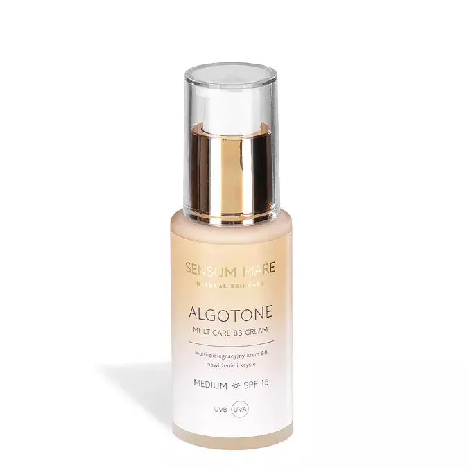 Sensum Mare - Algotone - Krem BB - Medium - krem BB bogaty w pielęgnujące skórę składniki aktywne. Posiada naturalne, aksamitne wykończenie, skutecznie kryje drobne niedoskonałości bez tworzenia efektu maski. Dodatkowo zawiera kompleksy: Plankton Glass Flower®, Kompleks, Pollustop®chroniące przed prominiowaniem UVA, UVB, podczerwonym oraz niebieskim, a także przez zanieczyszczeniami powietrza. Kompleks z 5 alg morskich i woda z lodowca norweskiego zapewniają skórze silne nawilżenie. Produkt zawiera 97% składników pochodzenia naturalnego i jest wegański.