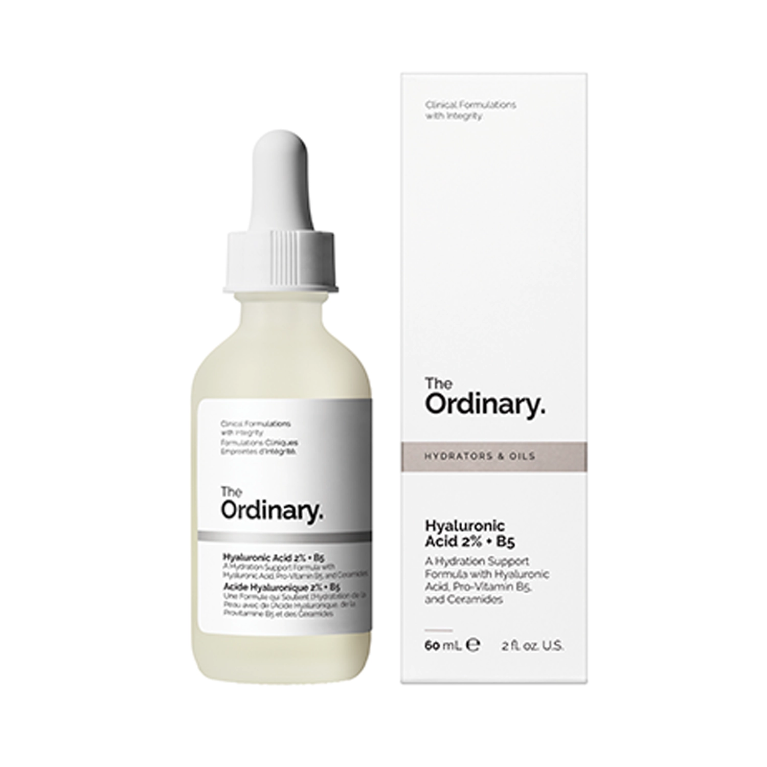 The Ordinary - Hyaluronic Acid 2% + B5 - preparat na bazie wody o udoskonalonej formule łączący molekuły kwasu hialuronowego o niskiej, średniej i wysokiej masie cząsteczkowej oraz zaawansowany polimer usieciowany kwasu hialuronowego. Opracowany, aby zwiększać nawilżenie skóry. Przeciwdziała występowaniu zmarszczek i niedoskonałości tekstury skóry. Prowitamina B5 w składzie dodatkowo poprawia nawilżenie, wygładzając i zwiększając jędrność skóry. Z kolei ekstrakt z alg Ahnfeltia Concinna wspiera regenerację naskórka oraz uelastycznia go, a witamina E jako silny i skuteczny antoksydant, hamuje procesy starzenia się skóry. Nowością w produkcie jest mieszanka ceramidów, znanych jako sfingolipidy, które wspomagają barierę ochronną, aby utrzymać wilgoć w skórze. Serum bardzo szybko się wchłania, nie pozostawiając lepkiego filmu na powierzchni skóry. Kosmetyk ma pH 6,50–7,50. Nowa formuła ma lekko żółty odcień w porównaniu z poprzednią formułą ze względu na dodanie mieszanki ceramidów.