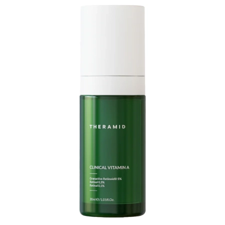 Theramid - Clinical Vitamin A - zaawansowana kuracja przeznaczona szczególnie dla skór z oznakami starzenia. Zawiera 3 formy witaminy A - Granactive Retinoid (Hydroxypinacolone Retinoate) w stężeniu 5%, 0,3% retinol oraz 0,1% retinal. Retinoidy wpływają na produkcję kolagenu i elastyny, dzięki czemu działają przeciwzmarszczkowo, stymulują odnowę komórkową, wygładzają i wyrównują koloryt skóry. Dodatkowo zmniejszają przetłuszczanie skóry i redukują niedoskonałości skóry. Skład został wzbogacony o ceramidy, które wzmacniają barierę ochronną skóry, regenerują i odżywiają. Z kolei ekstrakt z planktonu nawilża, uelastycznia i łagodzi, a witamina E chroni przed działaniem wolnych rodników. Serum działa w trakcie snu, zapewnia widoczne efekty przeciwstarzeniowe. Kosmetyk ma wegańską, bezzapachową formułę.