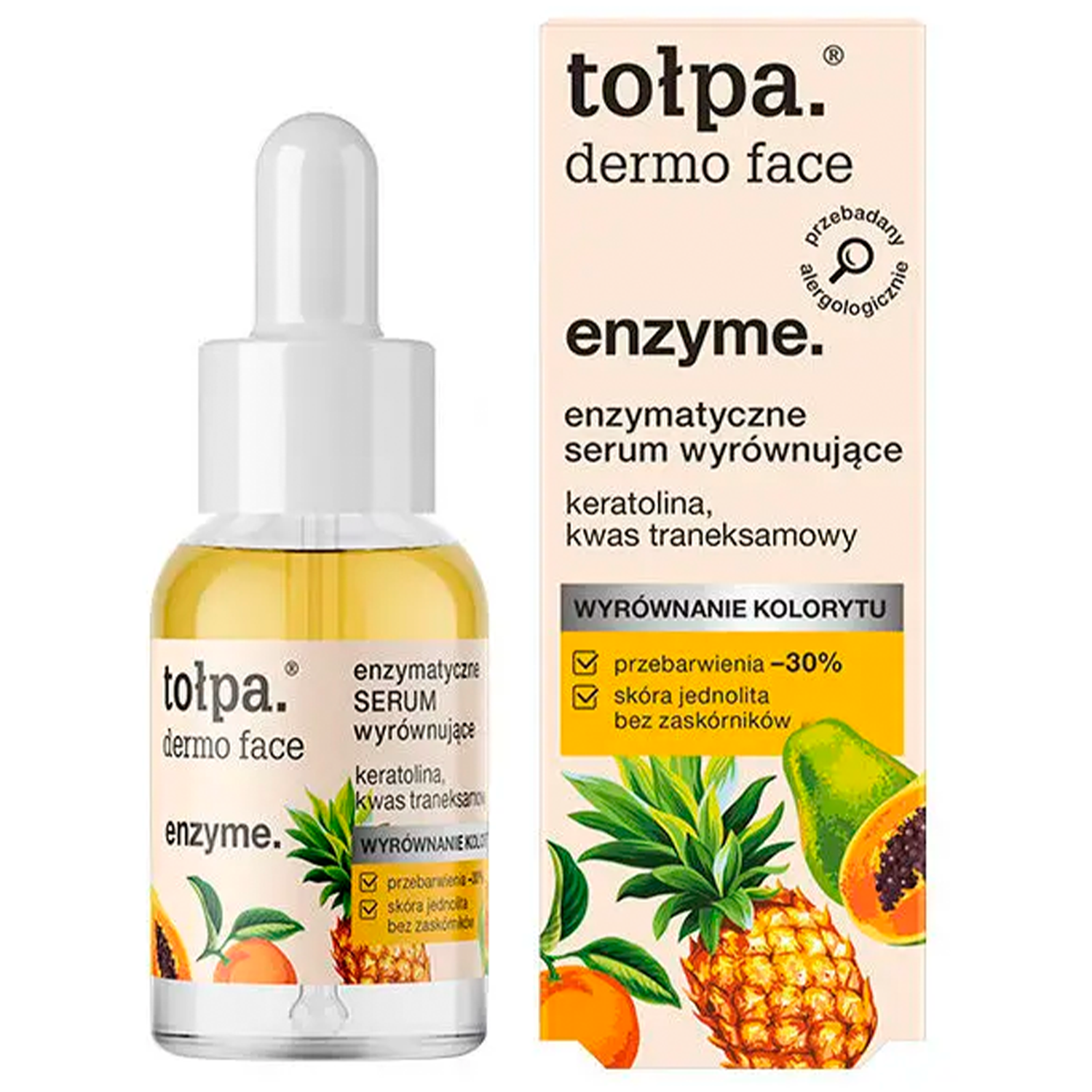 Tołpa - Enzyme - Enzymatyczne Serum Wyrównujące Koloryt Skóry - serum przeznaczone do pielęgnacji skór zmagających się z nierównym kolorytem. Dzięki zawartości kwasu traneksamowego, produkt zwalcza przebarwienia istniejące i zapobiega ich nawrotom. Dodatkowo zmniejsza zaczerwienienia. Charakterystyczny dla marki składnik torf tołpa.® wspomaga regenerację skóry oraz jest antyoksydantem. Enzym z bakterii Bacillus wspomaga procesy złuszczania naskórka, dzięki czemu wygładza skórę i potęguje działanie kwasu traneksamowego. Z kolei olej z baobabu oraz olej annato działają uelastyczniająco, antyoksydacyjnie i regenerująco.