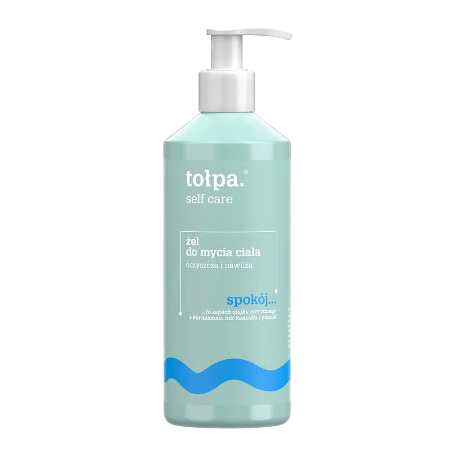 Tołpa - Self Care - Spokój - żel do mycia ciała o zapachu olejku eterycznego z kardamonu, nut kadzidła i paczuli. Otula skórę przyjemnym, aromaterapeutycznym zapachem, a pielęgnujące składniki tj. torf tołpa®, olej ze słodkich migdałów, inulina czy ekstrakt z lnu wygładzają szorstką skórę, poprawiają jej poziom nawilżenia i wspomagają regenerację. Żel tworzy przyjemną pianę, a zawarte składniki aktywne pielęgnują skórę już na etapie jej mycia. Produkt zamknięto w wygodnym opakowaniu z pompką.