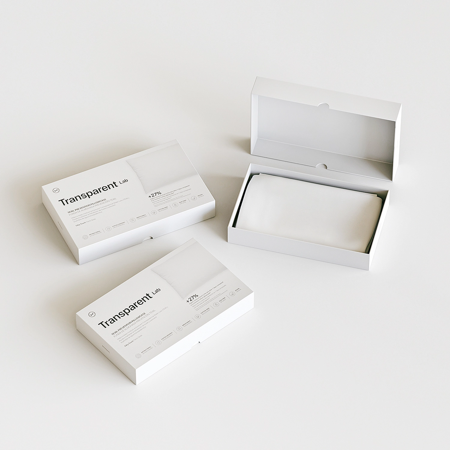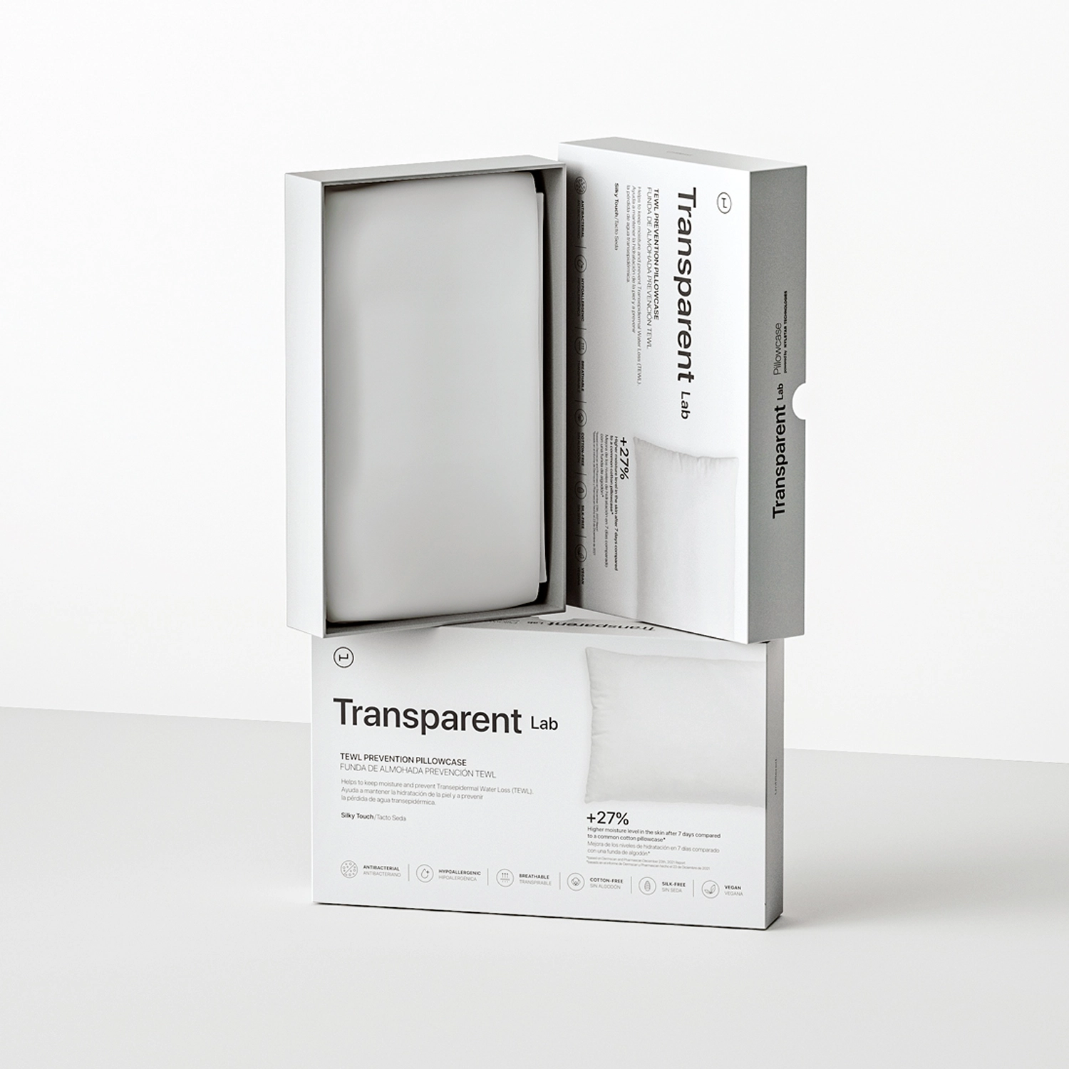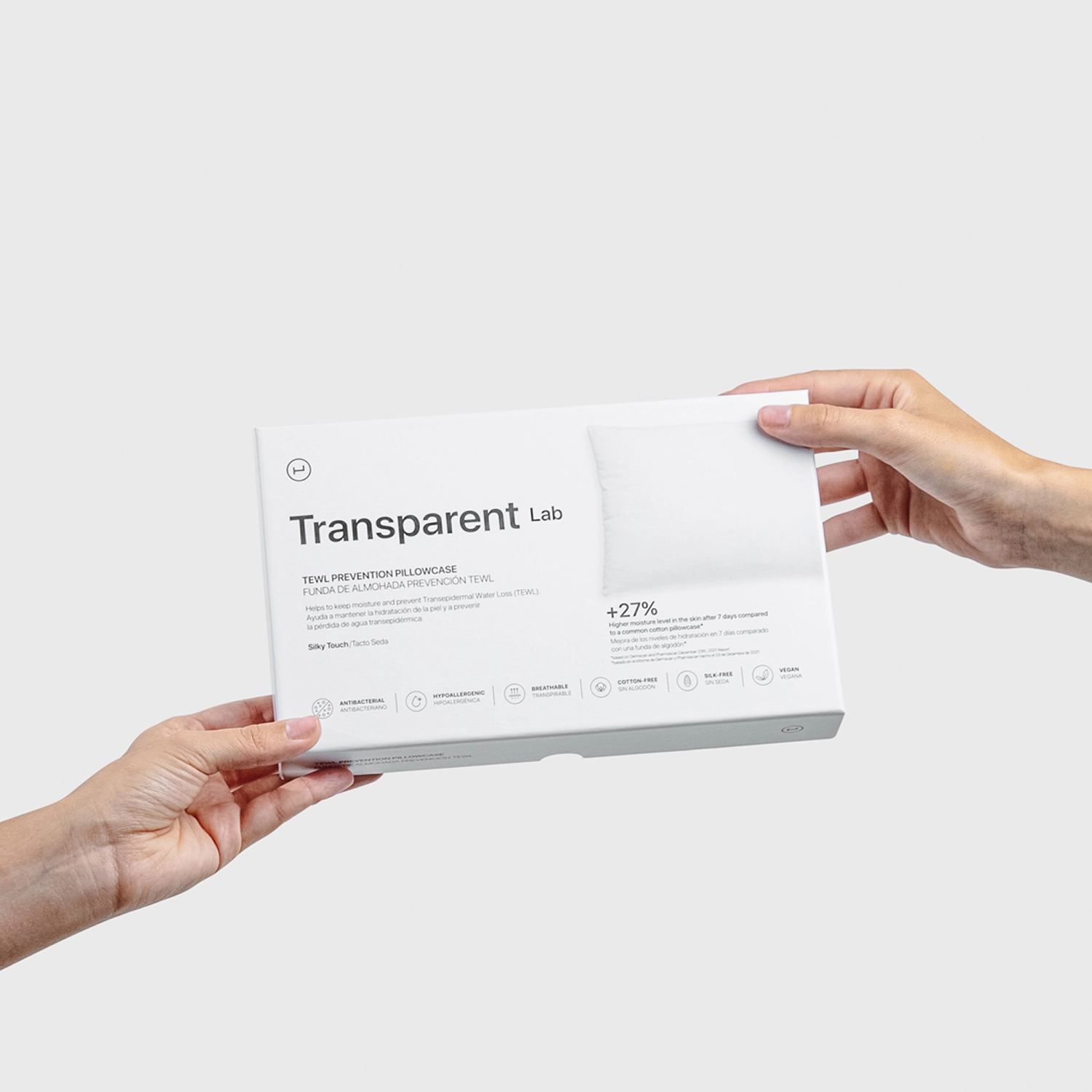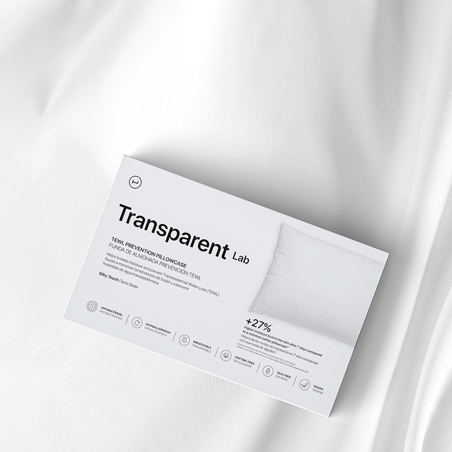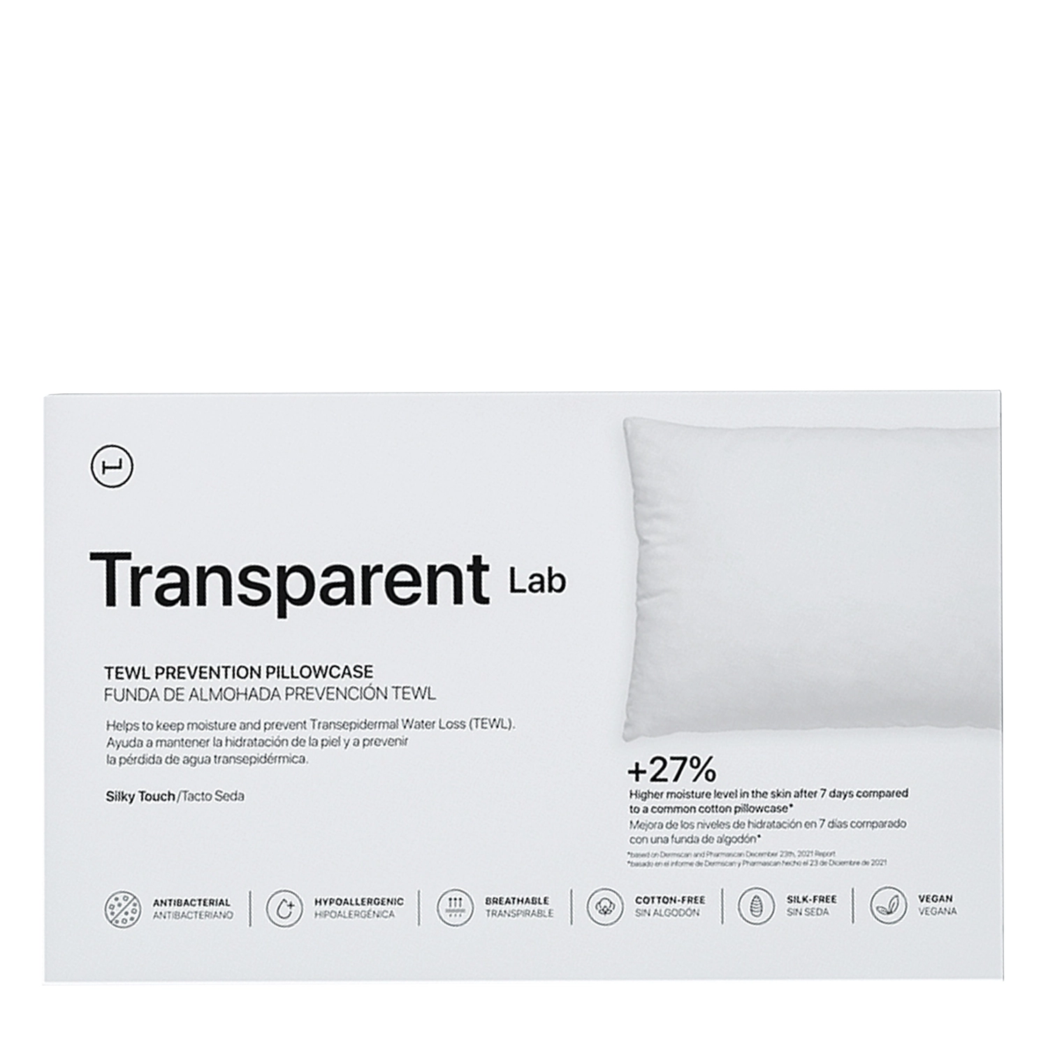 Transparent Lab - Poszewka na Poduszkę - miękka poszewka na poduszkę, stworzona z myślą o osobach zmagających się z widocznymi drobnymi zmarszczkami, skórą suchą i łatwo łamiącymi się włosami. Delikatny materiał, z którego została uszyta poszewka - Meryl® - w mniejszym stopniu niż standardowy pochłania produkty pielęgnacyjne, dzięki czemu pozostają one na skórze dłuższy czas i mogą efektywniej działać. Pozwala także utrzymać wilgoć w skórze i zapobiega tworzeniu nowych drobnych linii na twarzy i szyi. Dodatkowo jony srebra osadzone w tkaninie hamują namnażanie się bakterii. Dzięki tym właściwościom poszewka sprawdzi się również u osób ze skórą skłonną do trądziku i alergii. Wymiary poszewki to 50x75 cm.