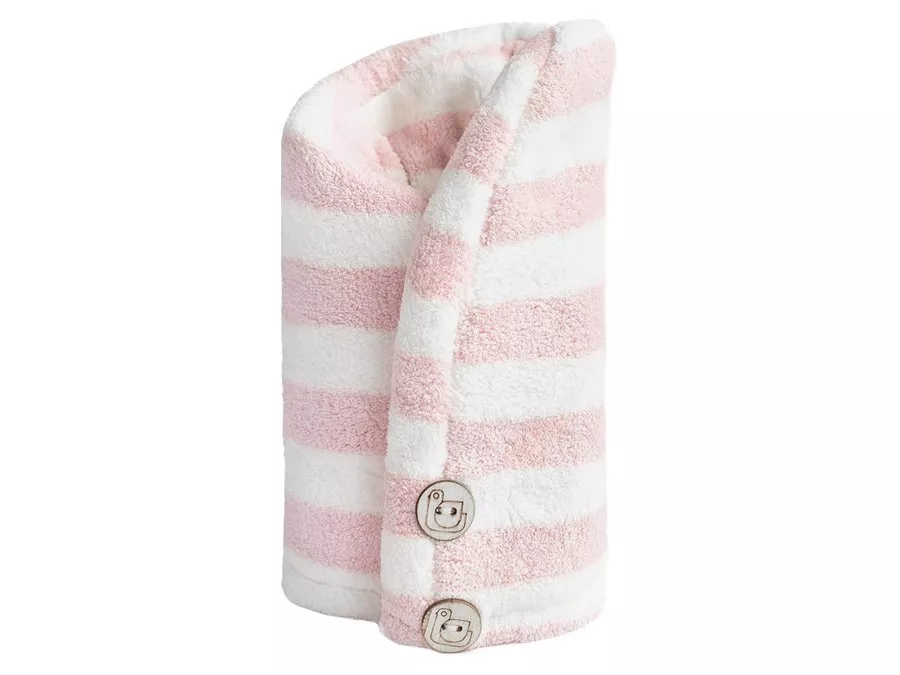 Trust My Sister - Ręcznik do Włosów z Mikrofibry - Różowo-Biały - delikatny ręcznik do włosów, który możesz formować w turban. Turban pozwala na odsączenie wody z włosów oraz nie powoduje ich uszkodzeń i zapobiega elektryzowaniu, nie powoduje plątania włosów i rozdwajania się końcówek. Ręcznik ma kształt kaptura, który ułatwia zakładanie na głowę, dodatkowo posiada dwa guziki, żeby można było dostosować jego kształt i żeby nie ciągnął włosów. Można go podczas nakładania masek oraz olejowania włosów, by olej lepiej wnikał we włosy, a dodatkowo zapobiegał brudzeniu ubrań, czy pościeli, podczas nocnej pielęgnacji włosów.