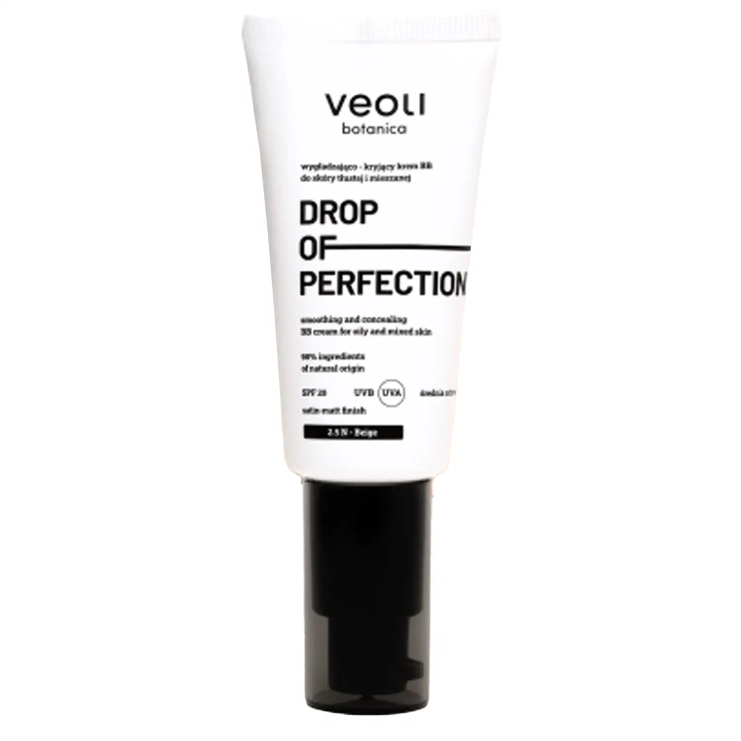 Veoli Botanica - Drop Of Perfection - 2.5 N - Beige - krem BB o bardzo lekkiej konsystencji i satynowym, długotrwałym wykończeniu. Kolor 2.5 N - Beige to kolor o neutralnym tonie, wpadający w odcienie piaskowego beżu. Stworzony na bazie składników pochodzenia roślinnego, zapewnia wygładzenie skóry i ochronę przed aktywnością wolnych rodników. Krem zawiera kompleks cyklopeptydów Poretect™, który sprawia, że skóra staje się bardziej elastyczna, ujścia gruczołów łojowych są mniej widoczne i cera wygląda na zdrowszą. Obecny w kosmetyku hialuronian sodu wiąże wodę w naskórku i zapewnia uczucie nawilżenia, a Phytessence™ Blue Daisy - fitoaktywny ekstrakt z niebieskiej stokrotki działa przeciwzapalnie, kojąco na wrażliwą skórę i łagodzi podrażnienia. Dodatek ekstraktu z liści kulnika koi skórę i spowalnia procesy starzenia. Krem BB zawiera w składzie mineralny filtr SPF20, który chroni przed działaniem promieniowania słonecznego. Produkt umożliwia stopniowanie krycia, jest bezzapachowy i nadaje się do skóry wrażliwej. Jest wegański i zgodny z less waste.