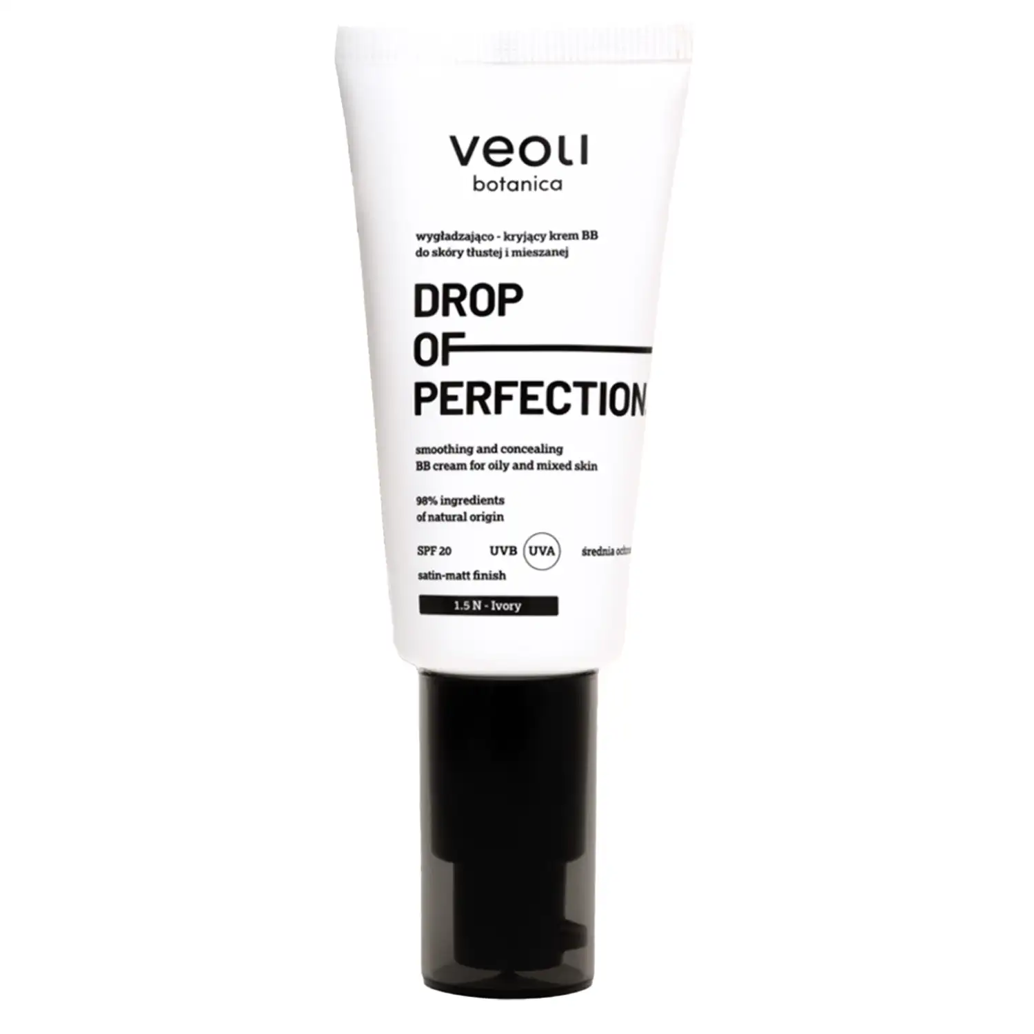 Veoli Botanica - Drop Of Perfection - 1.5 N - Ivory - krem BB o bardzo lekkiej konsystencji i satynowym, długotrwałym wykończeniu. Kolor 1.5 N - Ivory to jasny kolor, z neutralnym tonem. Stworzony na bazie składników pochodzenia roślinnego, zapewnia wygładzenie skóry i ochronę przed aktywnością wolnych rodników. Krem zawiera kompleks cyklopeptydów Poretect™, który sprawia że skóra staje się bardziej elastyczna, ujścia gruczołów łojowych są mniej widoczne i cera wygląda na zdrowszą. Obecny w kosmetyku hialuronian sodu wiąże wodę w naskórku i zapewnia uczucie nawilżenia, a Phytessence™ Blue Daisy - fitoaktywny ekstrakt z niebieskiej stokrotki działa przeciwzapalnie, kojąco na wrażliwą skórę i łagodzi podrażnienia. Dodatek estraktu z liści kulnika koi skórę i spowalnia procesy starzenia. Krem BB zawiera w składzie mineralny filtr SPF20, który chroni przed działaniem promieniowania słonecznego. Produkt umożliwia stopniowanie krycia, jest bezzapachowy i nadaje się do skóry wrażliwej. Jest wegański i zgodny z less waste.