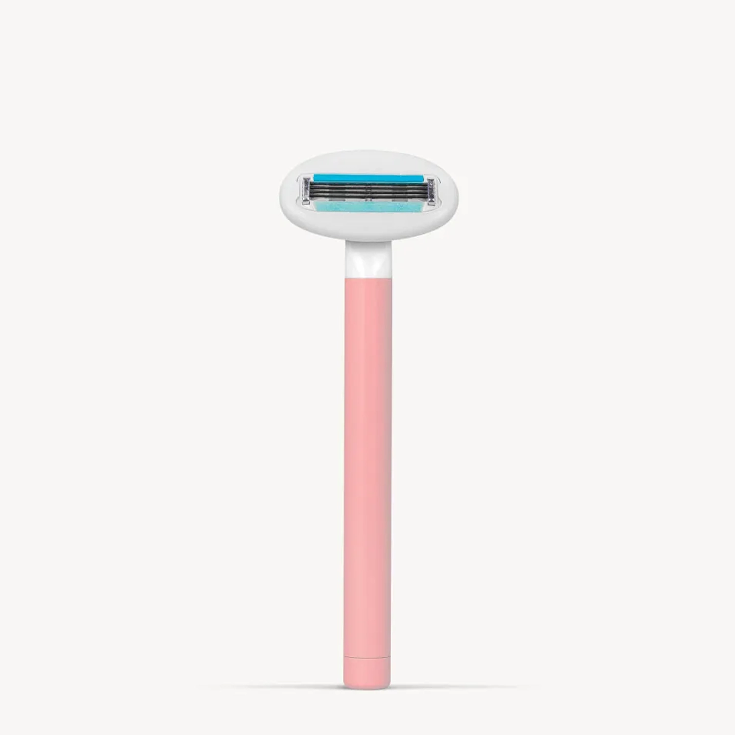 Your Kaya - Wielorazowa Maszynka do Golenia z Dwiema Główkami do Ciała - Blush - maszynka do golenia o długiej i lekkiej rączce, z wymiennymi główkami. Precyzyjna końcówka z czterema ostrzami i jej właściwość pochylenia do 40° zmniejszają ryzyko zacięć, ułatwiają bezpieczne i skuteczne golenie każdego miejsca na ciele. Dodatkowo pasek nawilżający przy ostrzach nasączony został wegańską esencją z aloesem i witaminą E, dzięki czemu koi skórę w trakcie usuwania włosków. Dzięki przemyślanej konstrukcji maszynkę można łatwo rozkręcić, pozwalając jej wyschnąć również wewnątrz, co zwiększa higienę wielorazowego rozwiązania. W opakowaniu znajduje się lekka, aluminiowa rączka maszynki i dwie wymienne ruchome główki.